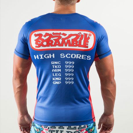 Tech stuff - this rashguard is made of 80% polyester 20% elastane. It has short sleeves so you can show off your gaming guns, and wearing it makes you 10 times more likely to beat your PB at Pacman.