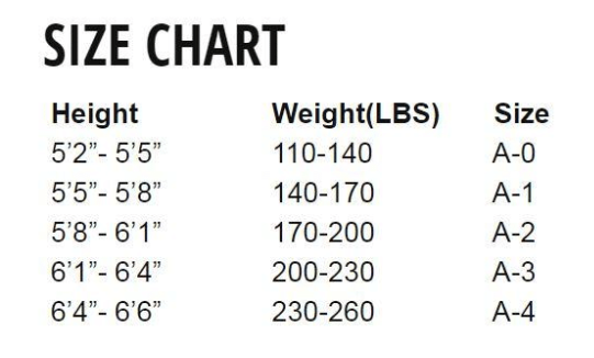While Vulkan Pro ECO Training BJJ Gi reduces pollution and helps to preserve the planet, it also gives you a nice feeling of confidence while wearing them. All you need to do is to choose your right size and for that reason we present you the official sizing chart: